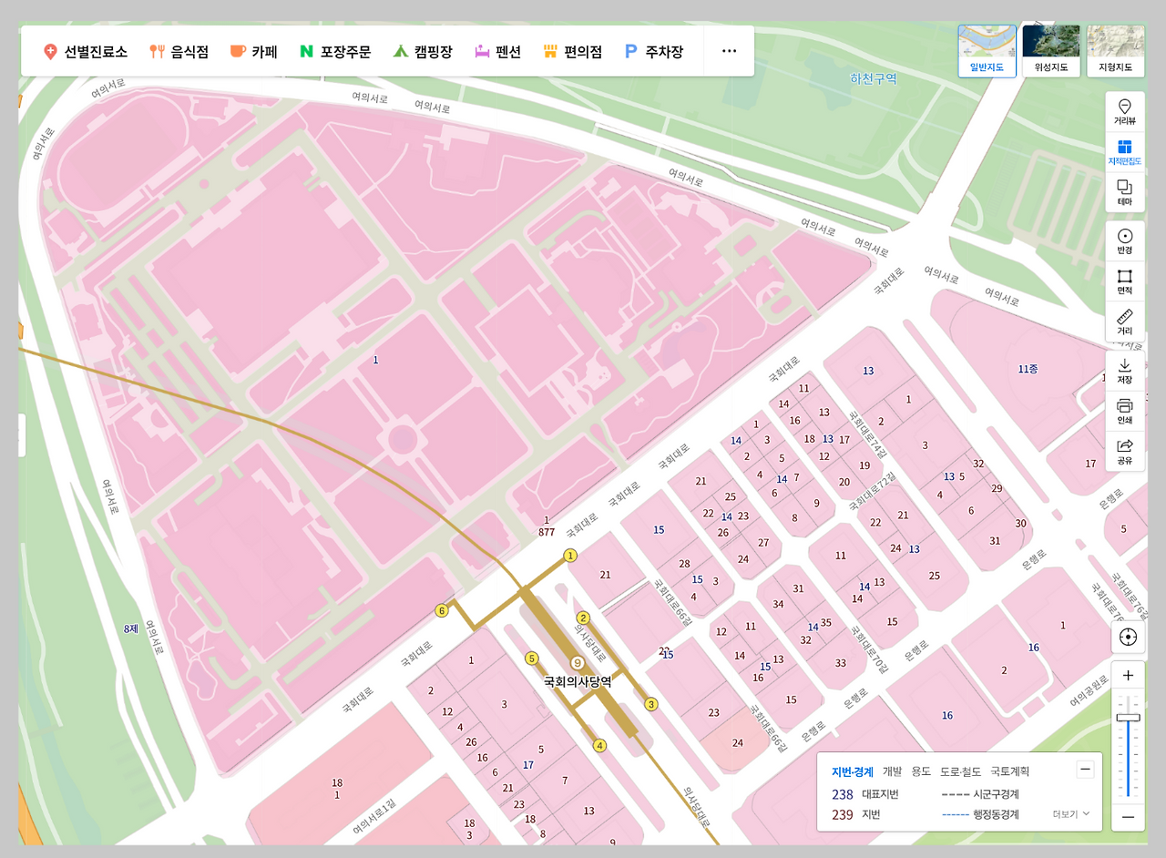 지적편집도를 켜면 토지의 경계선과 지번 정보가 지도에 표시됩니다. 지번이 보이지 않는 경우에는 지도를 확대하면 자연스럽게 나타납니다.