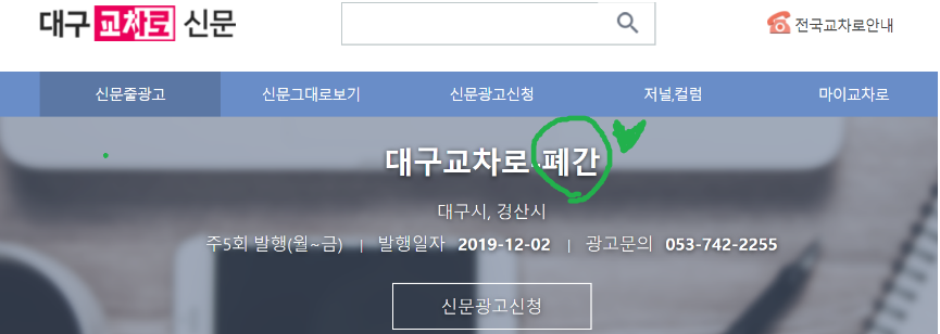요즘에는 인터넷이 너무 발달하다보니 종이로된 매체가 잘 팔리지 않습니다. 굳이 쓰래기가 생기는 것을 봐야할 이유가 없는것이지요. 그래서 여기서소개할 대구교차로 신문 역시 쉽게 볼수가 없습니다.. 대신에 홈페이지가 있을 뿐 입니다.