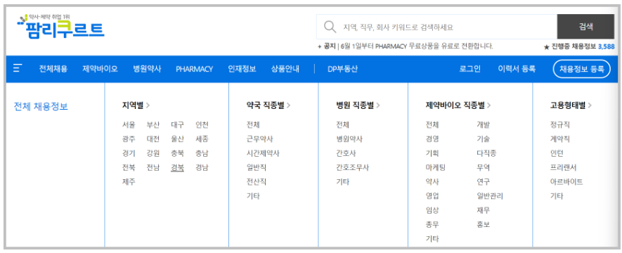 데일리팜에서 별도로 운영하는 구인구직 홈페이지가 바로 팜리쿠르트입니다. 이곳은 데일리팜에서 시작해 현재는 약사, 제약 취업 1위 플랫폼이라고 합니다. 일반병원, 대학병원약사는 물론 각종 제약회사의 채용정보를 이곳에서 확인할 수 있습니다.