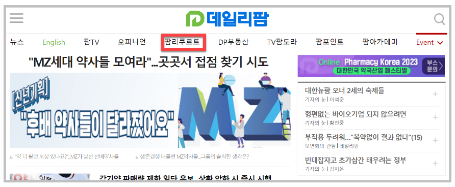 데일리팜 홈페이지에 접속하면 다음과 같은 화면을 볼 수 있습니다. 이곳에서 구인구직 홈페이지로 이동하기 위해선 팜리쿠르트를 클릭하면 됩니다.