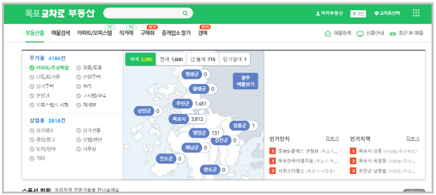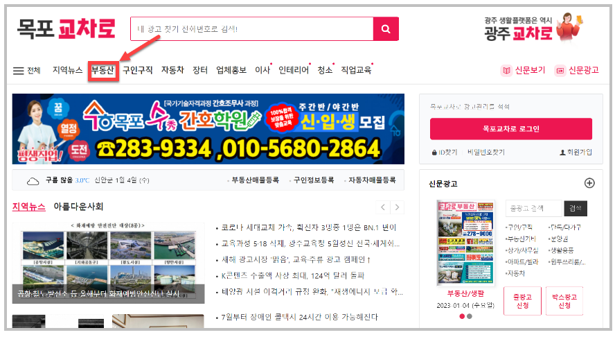 위 링크를 통해 별도의 과정 없이 한번에 목포교차로 부동산 메인화면으로 이동할 수 있습니다.