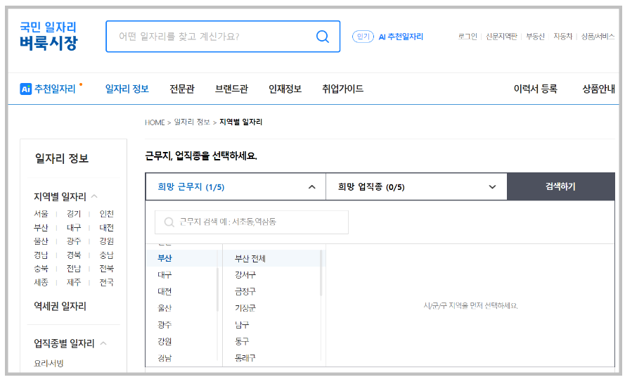 홈페이지에 접속한 이후에는 다음과 같이 지역을 설정할 수 있도록 필터링 창이 등장합니다. 이미 부산지역으로 선택이 되어있으므로 세부적인 지역을 추가적으로 선택한 이후 희망 업직종을 검색하면 현재 구인구직을 하고있는 곳의 정보를 손쉽게 얻을 수 있습니다.