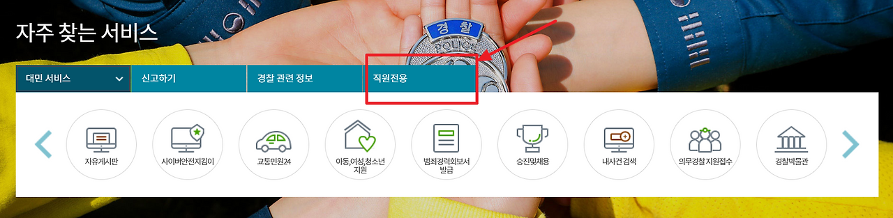 - 홈페이지 하단의 ‘자주 찾는’에서 ‘직원전용’ 탭 클릭