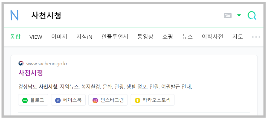 가장 먼저 해당 관청 홈페이지에 접속해야합니다. 사천시청을 예시로 하자면 위와 같이 네이버나 다음과 같은 포털사이트에 검색한 후 가장 먼저 뜨는 결과를 클릭하면 됩니다.