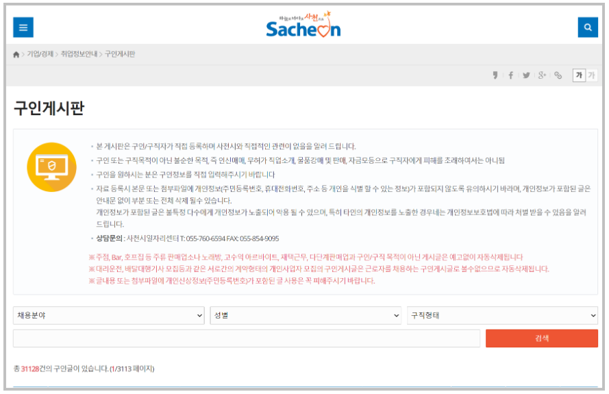 그래서 개인적으로 지방에서 일자리를 구한다면 해당 지역 생활정보지나 지자체홈페이지 일자리게시판을 참고하는 것도 좋은 방법이라고 생각합니다. 따라서 이번 포스팅에서는 사천시청을 예시로 들어 지자체 홈페이지에서 일자리를 구하는 방법을 이야기해보도록 하겠습니다.