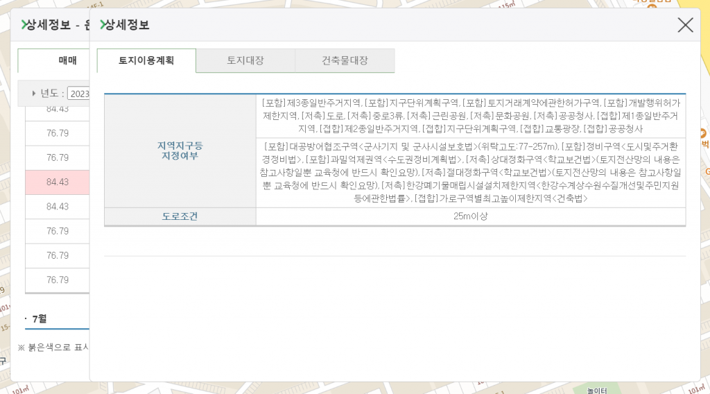 검색을 하면 상세정보로 매매나 전월세 내역을 볼 수 있습니다. 각 월마다 계약일, 금액 등의 정보를 알 수 있습니다. 계약이 해제가 되었다면 해제 여부와 발생일도 확인 가능합니다. '보기'를 클릭하면 토지 이용 계획, 토지대장, 건축물 대장, 건축연도 등 다양하게 알 수 있습니다.