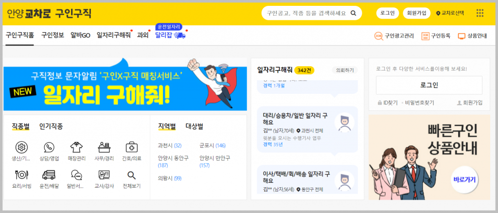 안양시의 일자리를 찾고 있다면, 안양교차로 홈페이지를 통해 간편하게 구인구직을 열람할 수 있습니다. 홈페이지 메인 메뉴에서 ‘구인구직’ 항목을 클릭하거나 아래의 바로가기 링크를 통해 직접 접속할 수 있습니다.