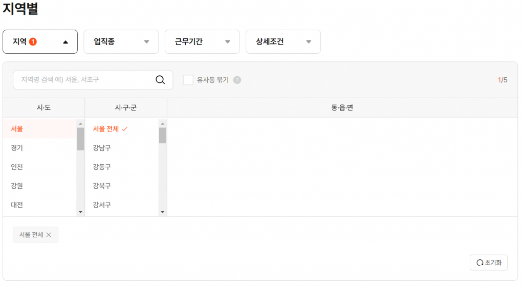 지역을 선택한 후에는 근무 조건을 기본적으로 설정합니다. 근무 기간, 업종, 근무 요일 등 다양한 옵션을 선택할 수 있습니다. 조건을 까다롭게 설정할수록 검색 결과는 줄어들겠지만, 조건을 너그럽게 설정하는 것이 좋을 것 같습니다.
