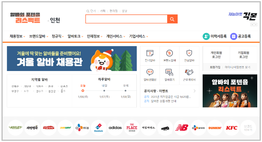 예를 들어 인천지역은 032 이므로 032.albamon.com이 인천 알바몬의 주소라고 할 수 있습니다. 하지만 주소창에 직접입력하는 것은 너무 번거로운 일이기 때문에 웹사이트 링크를 가져왔습니다.