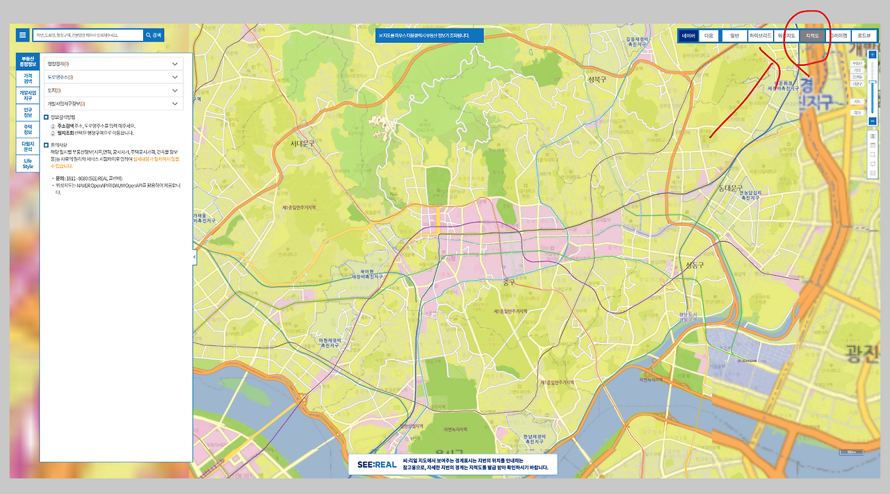 홈페이지에 접속한 후, 메인 화면에서 ‘씨:리얼 지도’ 메뉴를 클릭하면 과거 ‘온나라 지도’와 동일한 형태의 지도 서비스로 진입하게 됩니다. 이 지도는 전국의 토지 및 부동산 관련 졍보를 시각적으로 확인할 수 있는 기능을 제공합니다.
