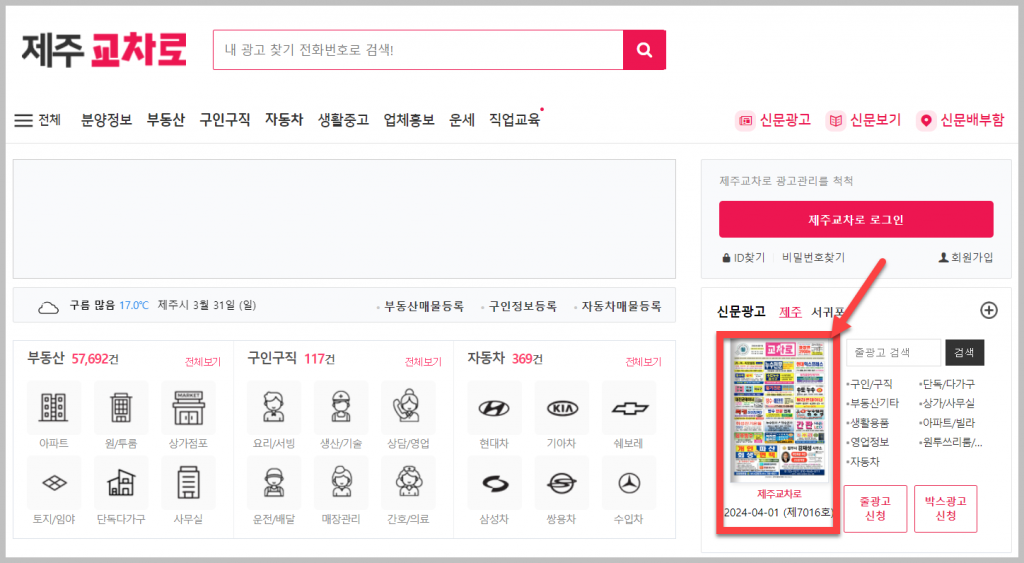 위의 링크를 클릭하여 헤당 페이지로 접속할 수 있습니다. 신문 그대로 보기를 원한다면 신문 아이콘을 클릭하면 되고, 부동산, 구인구직, 자동차 등을 보고싶다면 메뉴에서 선택하면 됩니다.