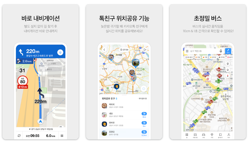 축척 기능이 추가되어 더 정밀한 위치 확인이 가능해졌습니다. 덕분에 초정밀 버스와 톡친구 위치공유도 가능합니다. 즐겨찾기 기능으로 원하는 장소를 지도에 별로 표시할 수 있게 되었습니다. 또한, 네이버에서 이미 제공하던 경유지 기능도 새롭게 추가되었습니다.