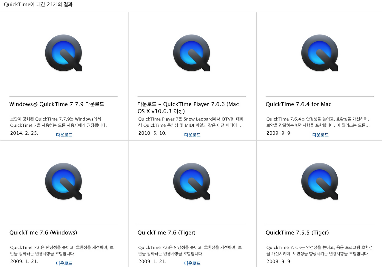 필요에 따라 구버전 퀵타임 플레이어도 검색을 통해 다운로드할 수 있습니다. 특수한 용도로 .mov 파일을 열어야 하는 경우가 아니라면, 일반 사용자라면 맥 환경에서만 사용하는 것을 추천드립니다.