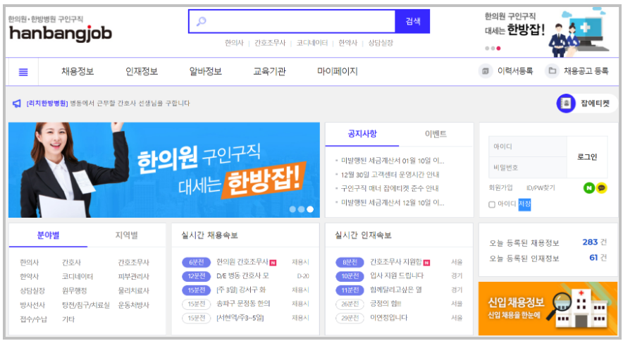 이 사이트는 이름에서부터 알 수 있는 것처럼 한의원과 한방병원, 한방요양병원에서 근무하는 간호사, 간호조무사, 원무과 직원들을 구인구직하는 곳 입니다. 의료인과 같은 전문직을 구하는 구인구직 사이트는 꽤 많지만 한의원을 중점으로 하고 있는 곳은 한방잡이 거의 유일할 것 같습니다.