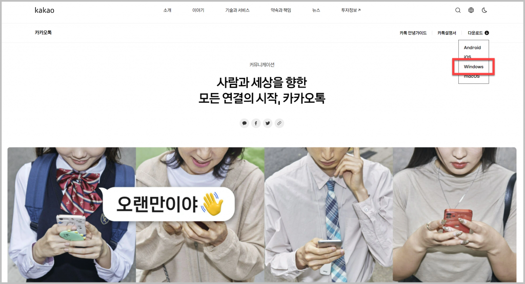 홈페이지에 들어가서 오른쪽 위를 보면 '다운로드'라고 되어 있습니다. 마우스를 올려보면 'Windows'라고 되어 있는 것을 클릭하면 카카오톡 PC 버전을 다운로드할 수 있습니다.