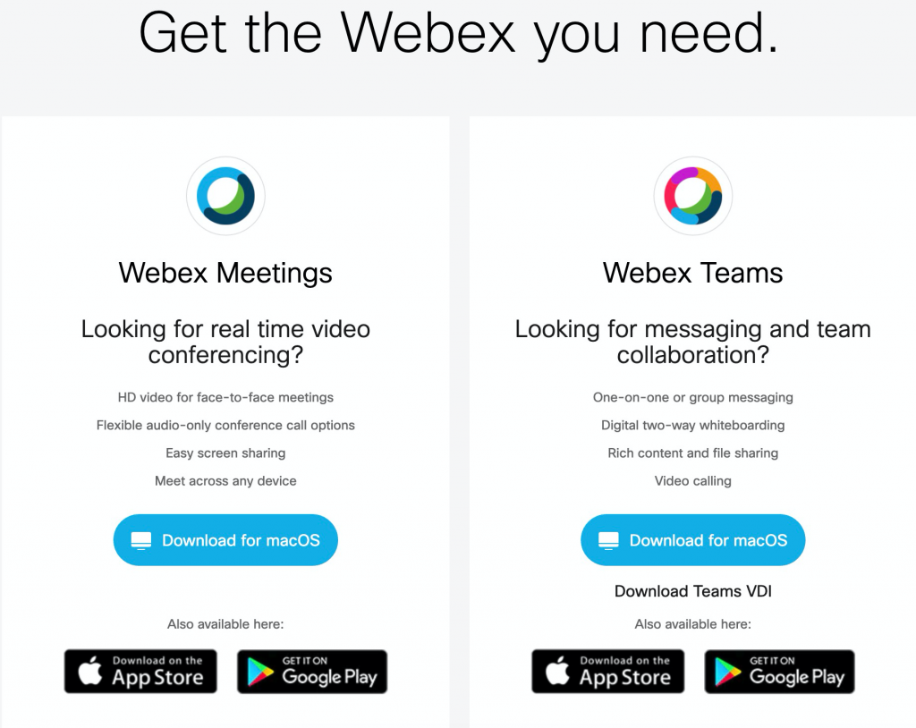 위 이미지를 보시면 알겠지만, Webex와 관련된 프로그램에는 Meetings와 Teams 두 가지가 있습니다. 오른쪽에 있는 것은 텍스트 커뮤니케이션과 유사한 슬랙과 같은 도구이며, 왼쪽에 있는 것은 화상 미팅 도구입니다. 줌과 비슷한 것은 왼쪽에 있는 미팅이라고 볼 수 있습니다.